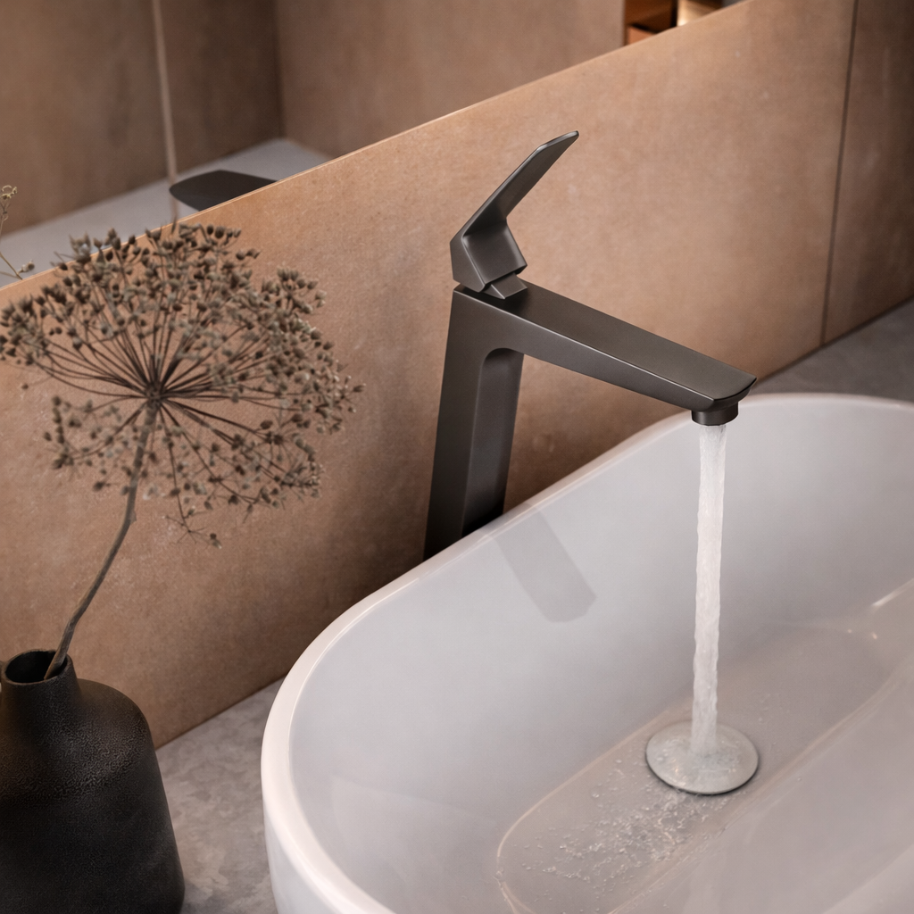 Bateria înaltă Ferro Vitto Verdeline BVI2LVLGM reprezintă simbioza perfectă între estetica industrială de lux și responsabilitatea față de mediu. Finisajul său distinctiv, Gunmetal, oferă o alternativă sofisticată la cromul tradițional, fiind extrem de apreciat în amenajările interioare contemporane pentru capacitatea de a masca petele de apă.