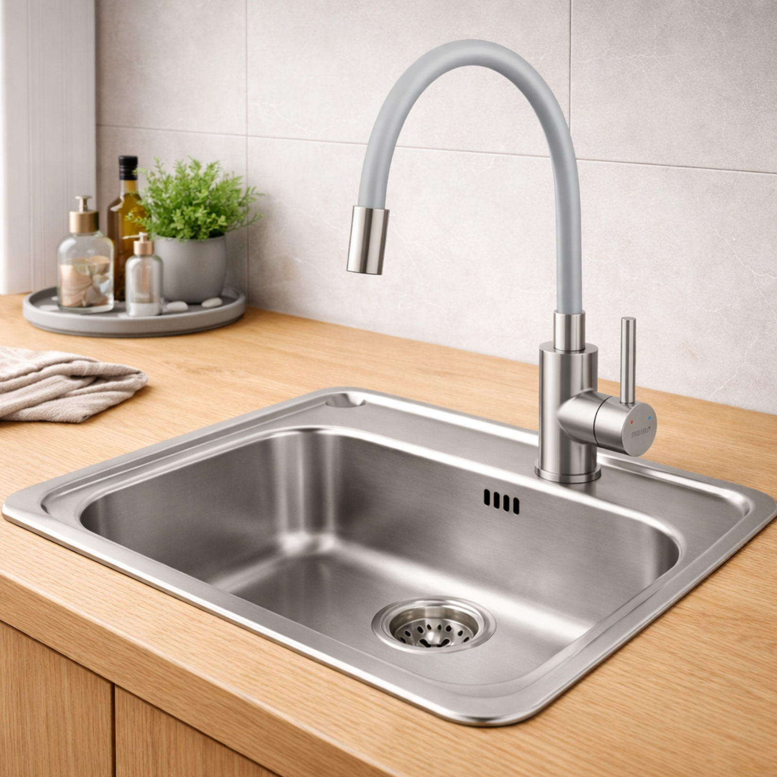 Pipă Flexibilă cu Memorie: Permite modelarea și menținerea formei dorite, oferind o libertate totală de mișcare în orice zonă a chiuvetei.