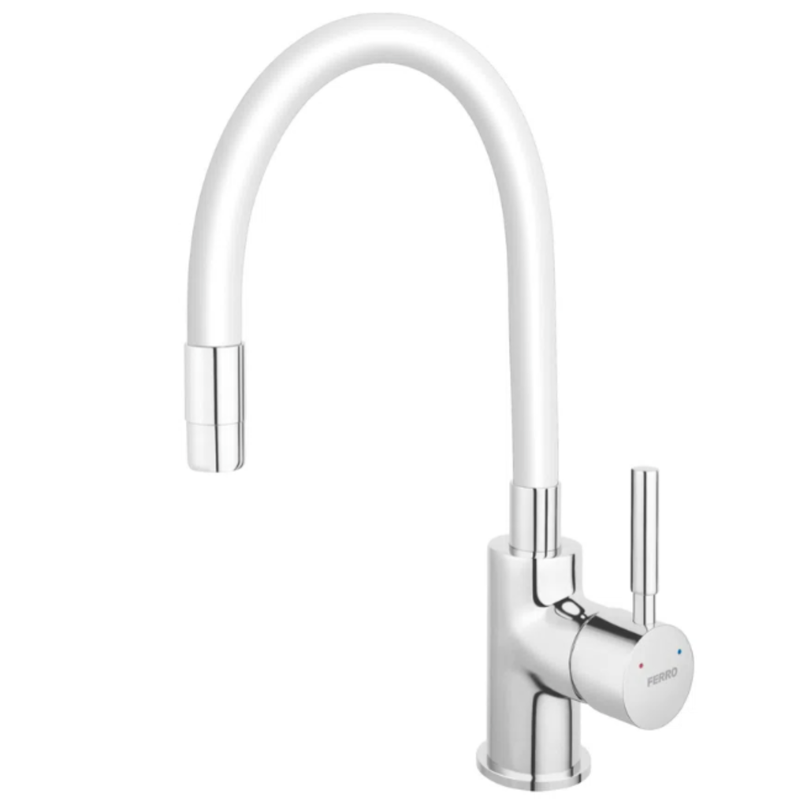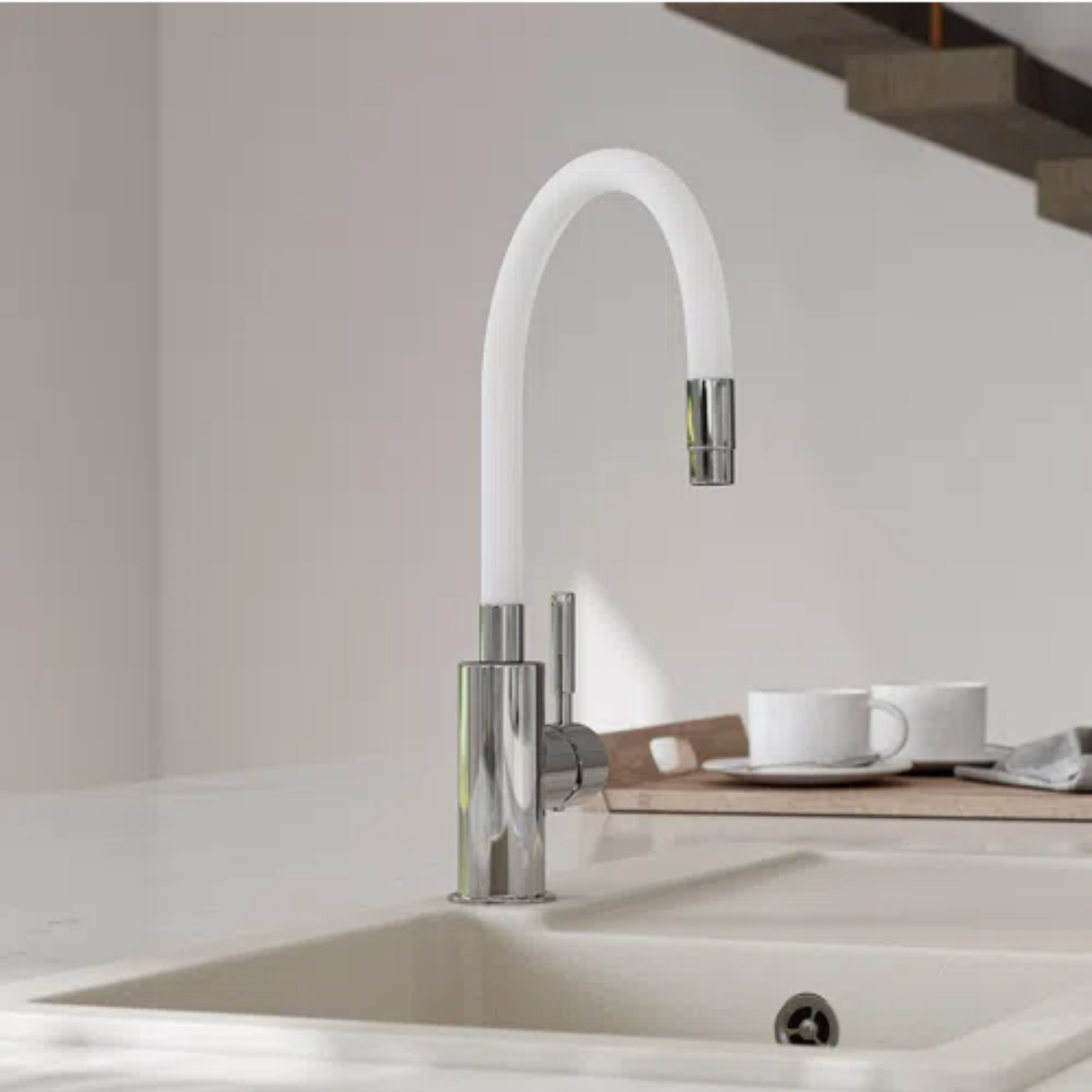 Bateria de bucătărie Ferro Zumba BZA4W este alegerea perfectă pentru cei care doresc să îmbine utilul cu estetica minimalistă. Finisajul de culoare alb al pipei flexibile oferă un aspect proaspăt și aerisit, fiind soluția ideală pentru bucătăriile moderne, scandinave sau cele care pun accent pe curățenie vizuală și simplitate.