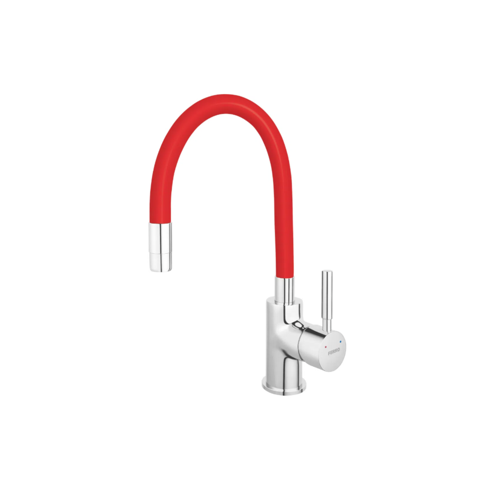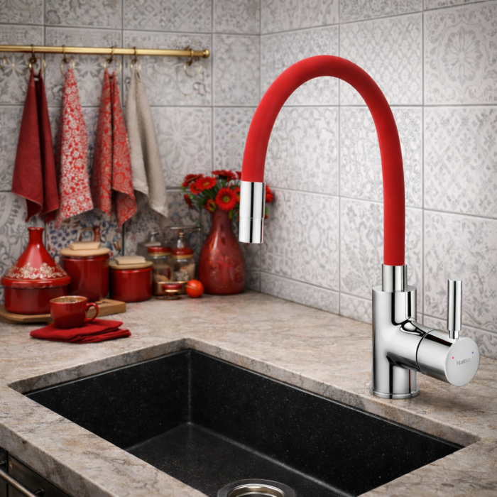 Bateria de bucătărie Ferro Zumba BZA4R este alegerea perfectă pentru cei care nu se tem de culori tari și caută o funcționalitate de top. Roșul vibrant al pipei flexibile nu este doar un element de stil, ci și o soluție practică, materialul fiind plăcut la atingere, rezistent și foarte ușor de curățat.